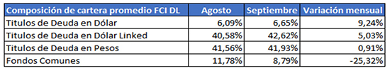 Durante el mes de septiembre, el promedio de fondos modificó su tenencia, aumentando la posición en instrumentos de deuda dólar y Dólar Linked, manteniendo la posición de deuda en pesos y reduciendo la tenencia en fondos de inversión colectiva.