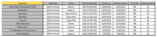 Se emitieron 9 (nueve) ON DL, lo que representa un incremento del 80% mensual con respecto al mes anterior. Los plazos de las emisiones oscilaron entre los 18-36 meses y con cupones fijos entre 0% y 4%. La mayoría de las empresas informadas lograron colocar deuda en dólares a tasa cero. Ello se explica, principalmente, a la creciente demanda inversora en busca de coberturas de tipo de cambio.